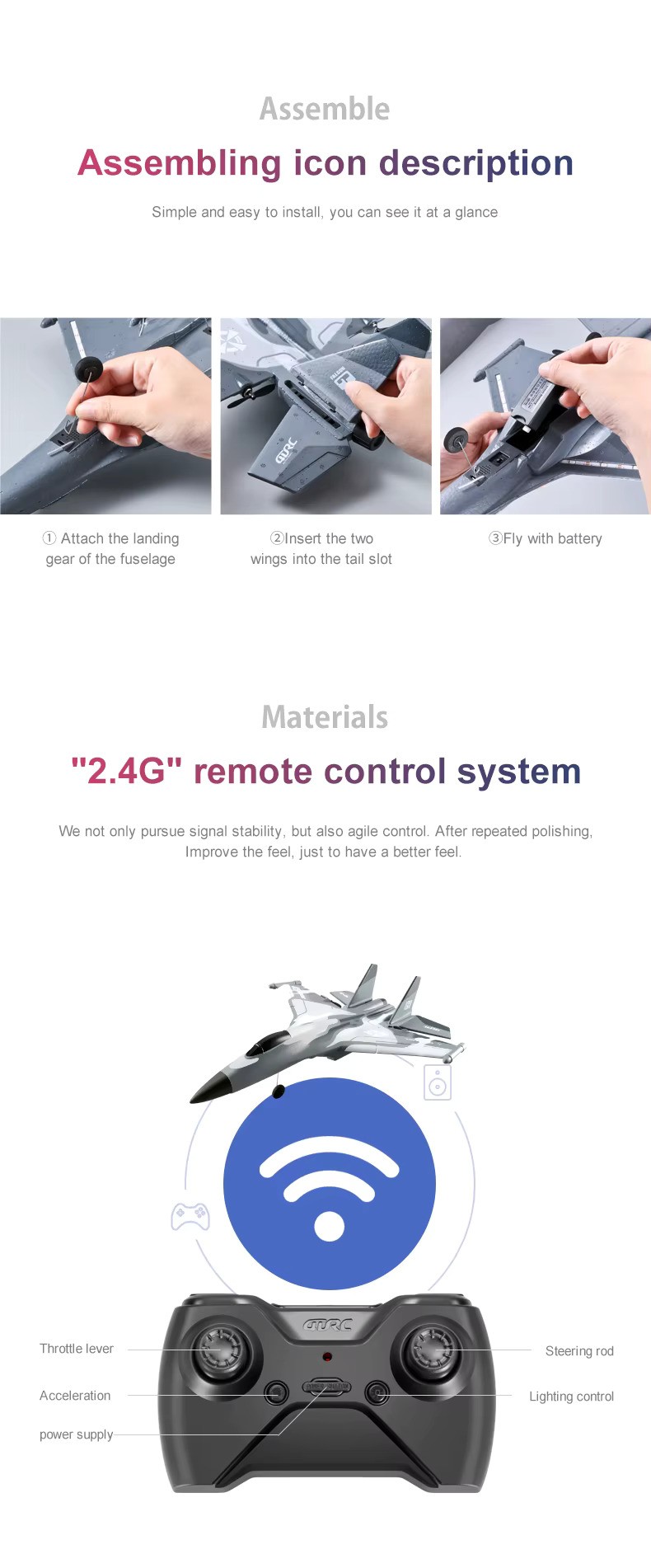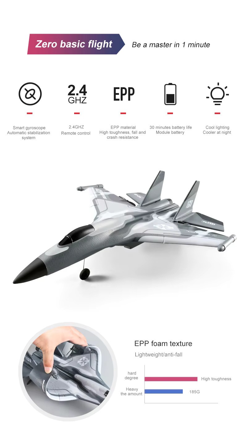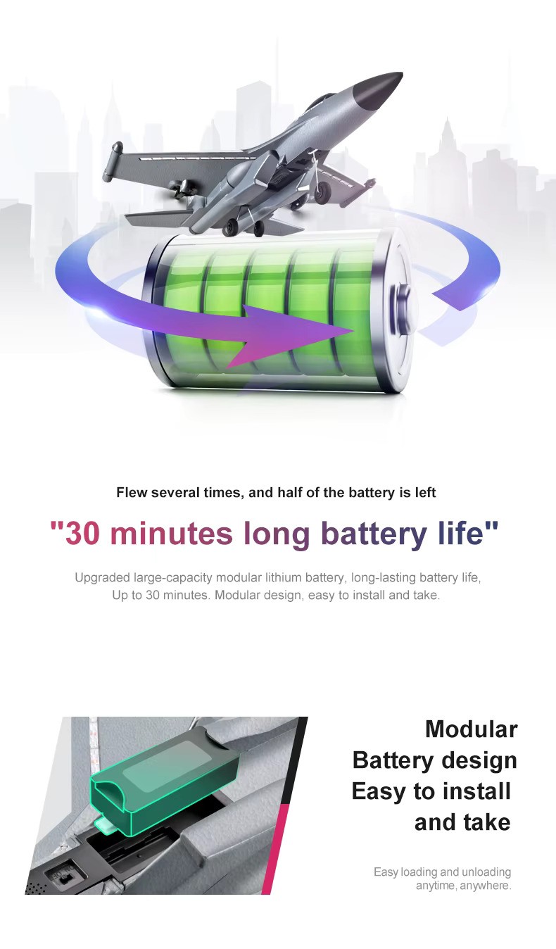 Powered by a 3.7V lithium battery, the aircraft offers up to 10–20 minutes of flight time on a single charge, with a control range of up to 200 meters. Its lightweight structure ensures smooth handling even in limited spaces, while the simple controls make flying easy and enjoyable for first-time pilots.