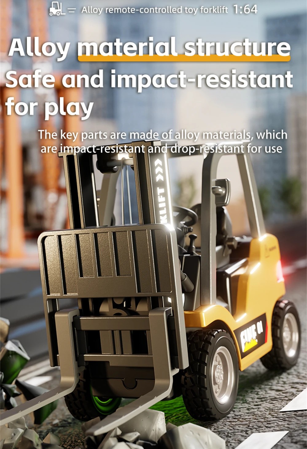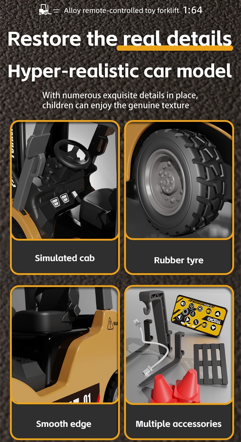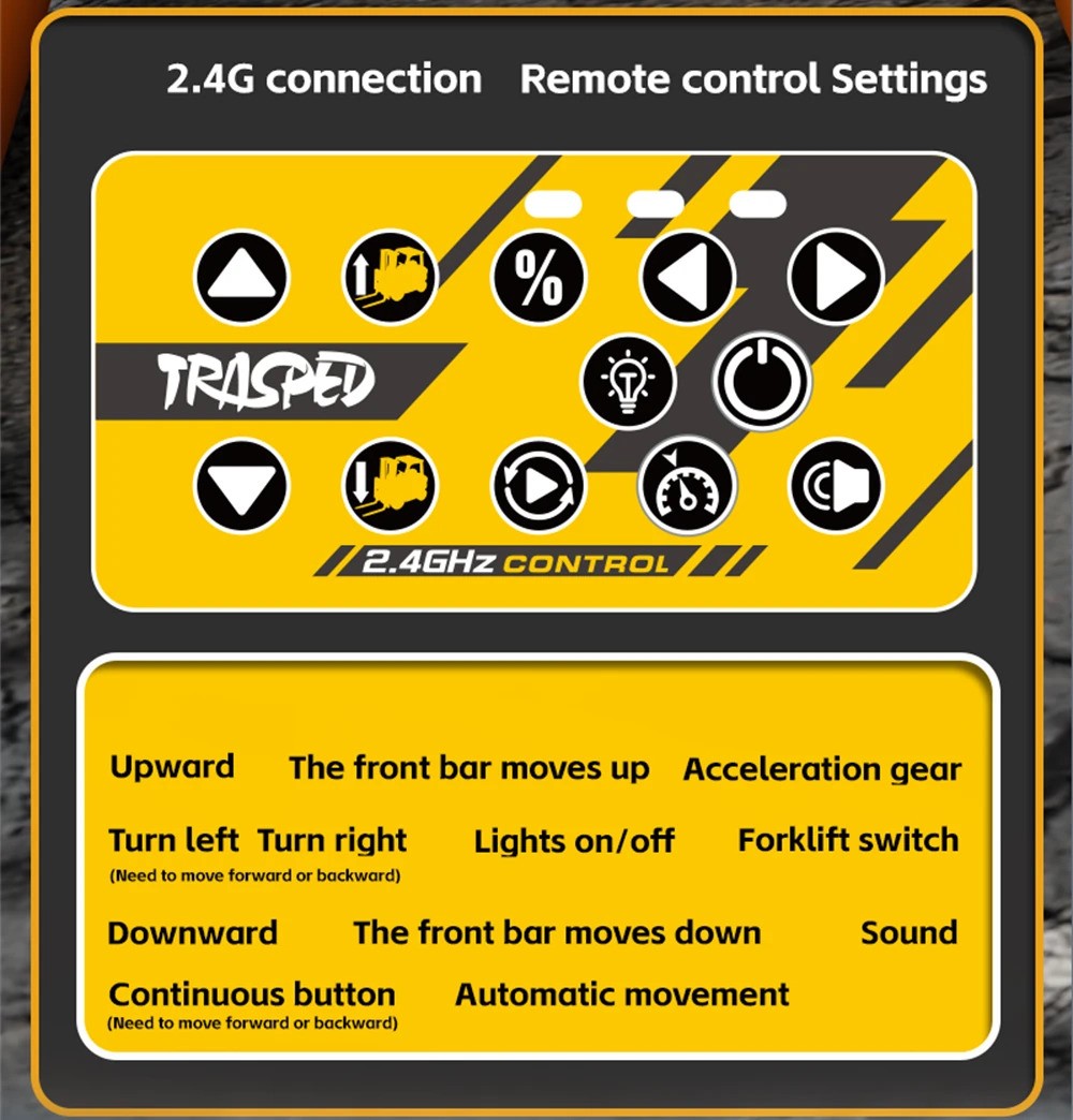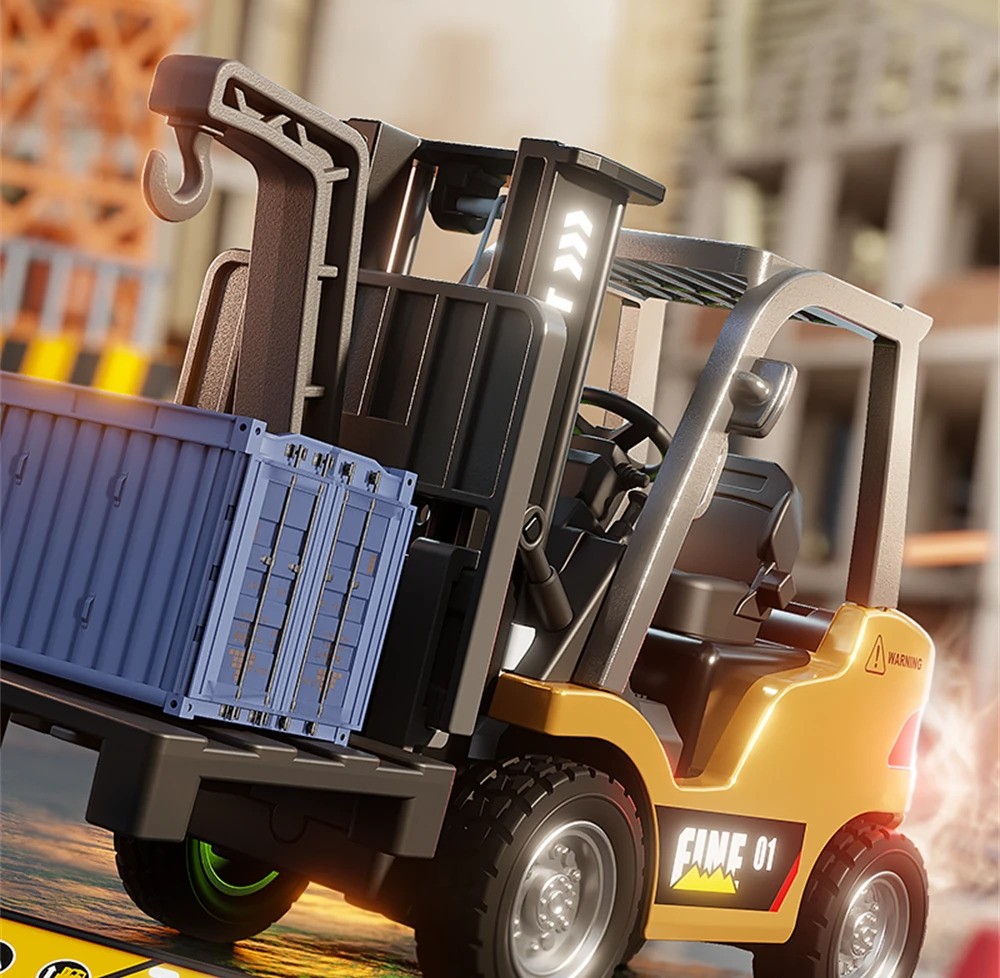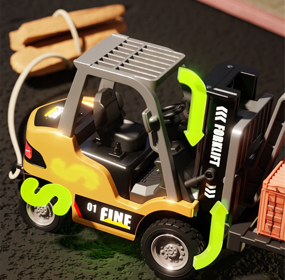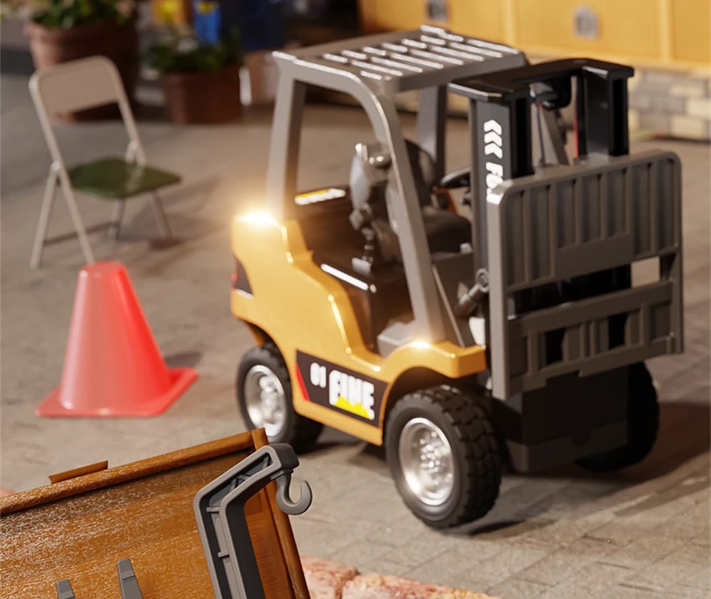 The HG4-243 by HG TRASPED is a highly detailed 1:64 scale alloy RC forklift, featuring realistic sounds, functional forklift mechanisms, adjustable speed, LED lights, and dual control operation. Perfect for RC collectors, kids, hobbyists, and mini construction vehicle fans.
