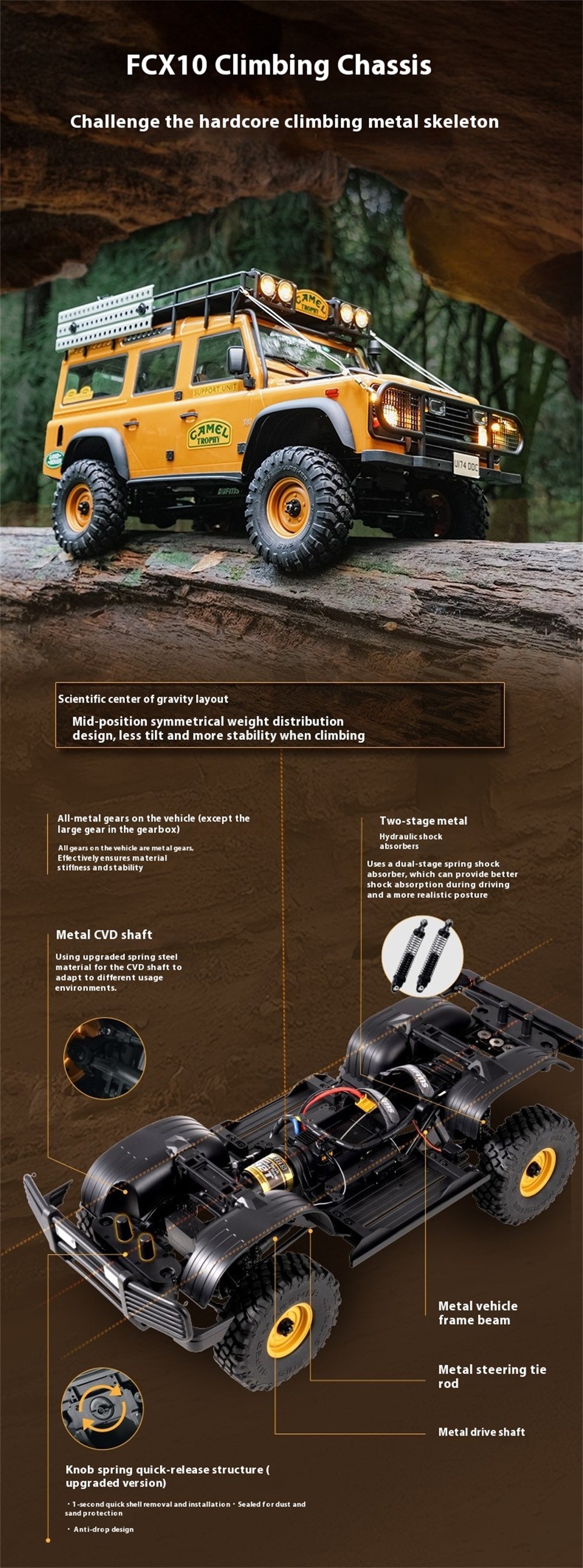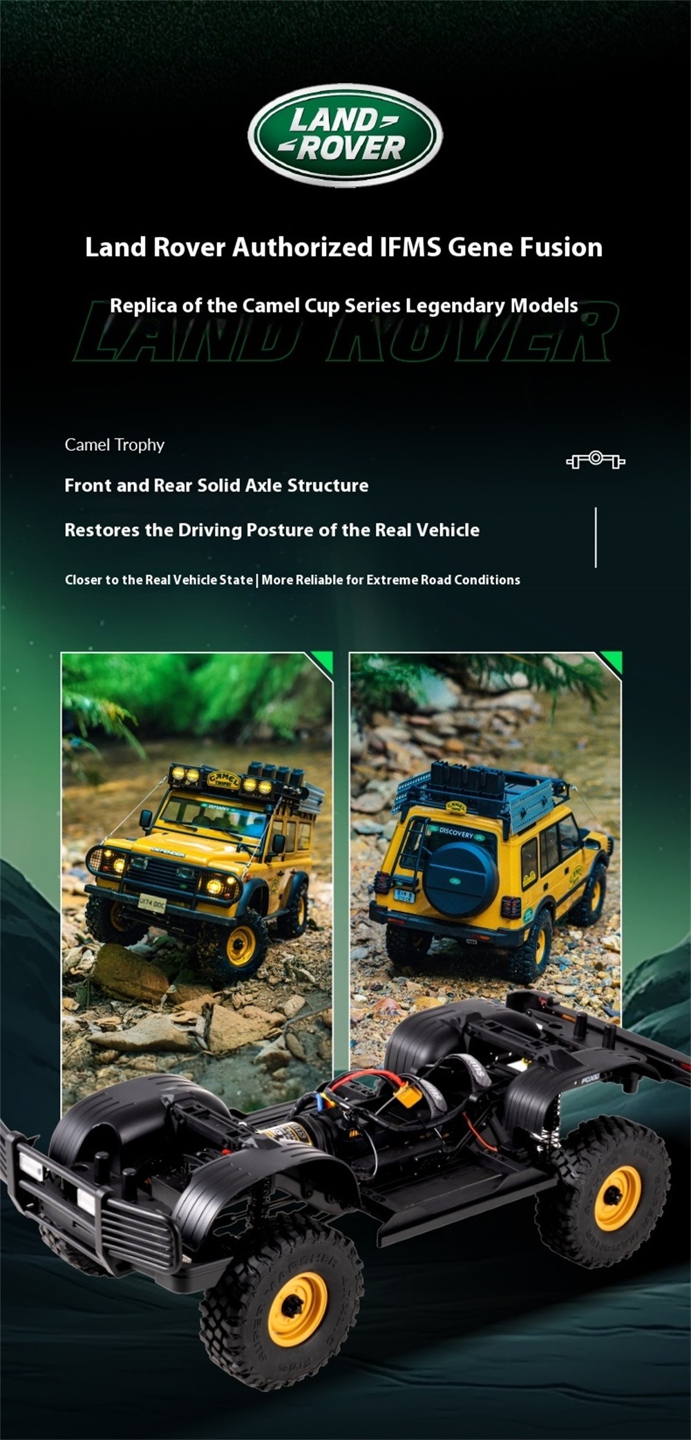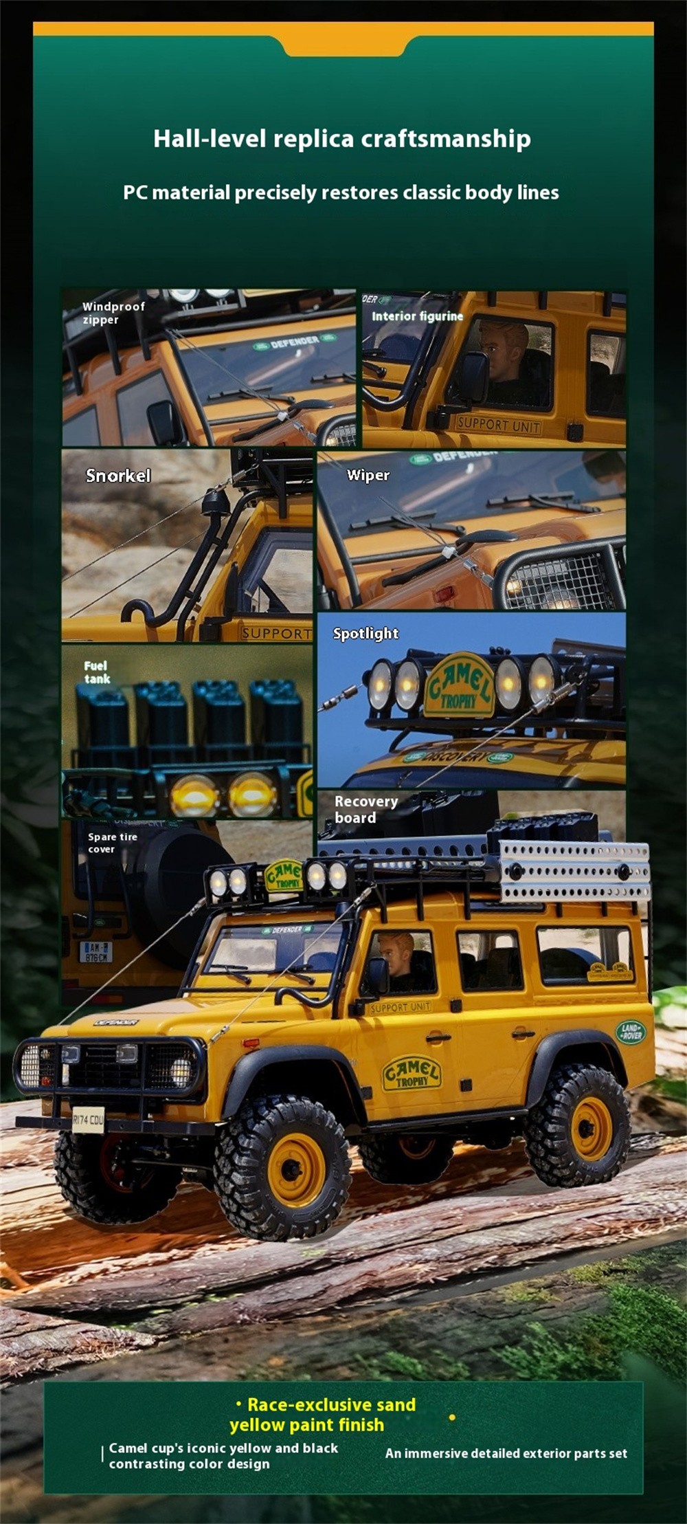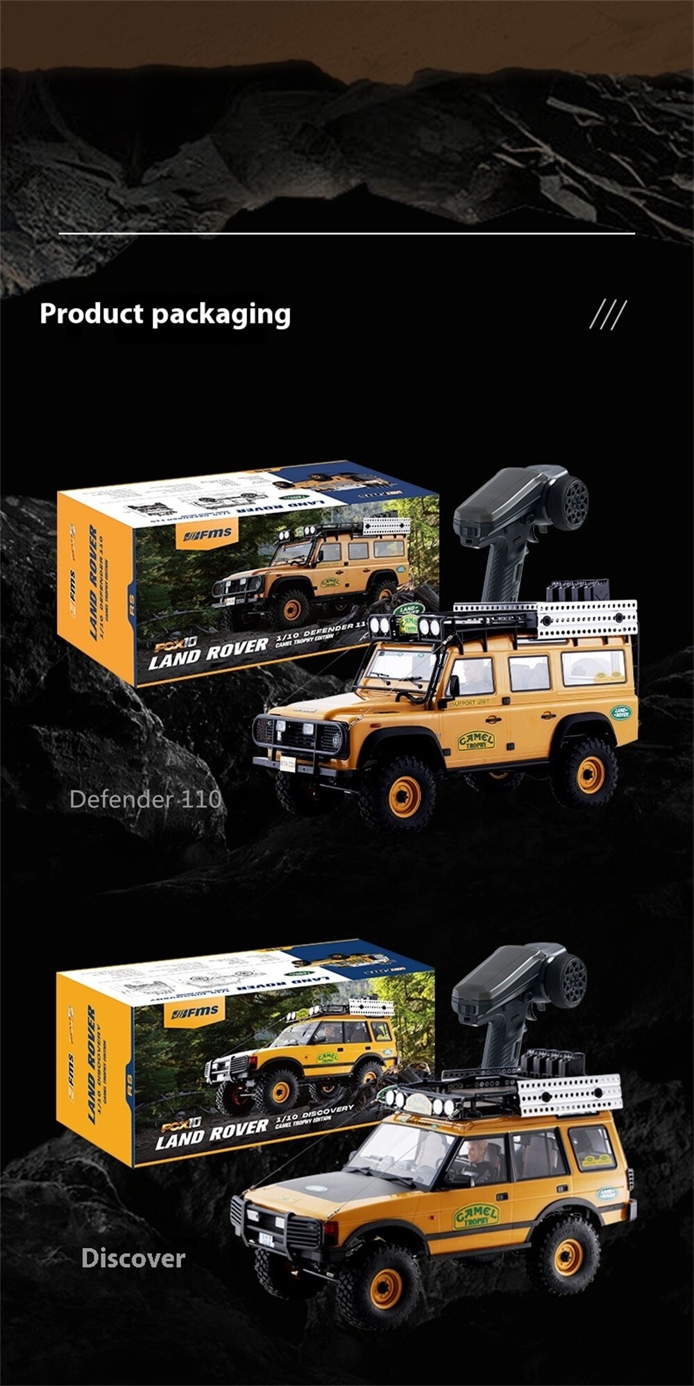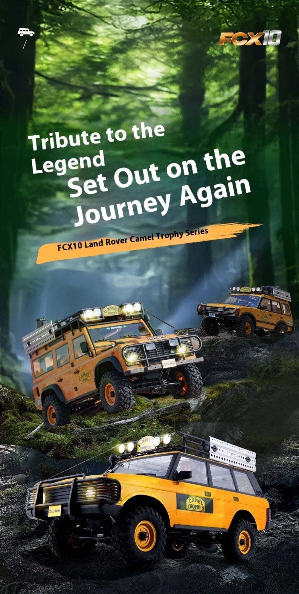 The FMS FCX10 Camel Trophy Edition delivers authentic scale realism and hardcore crawling performance. Officially licensed by Land Rover, this model recreates the legendary Camel Trophy machines — available as Discovery, Range Rover Classic, or Defender 110 editions.