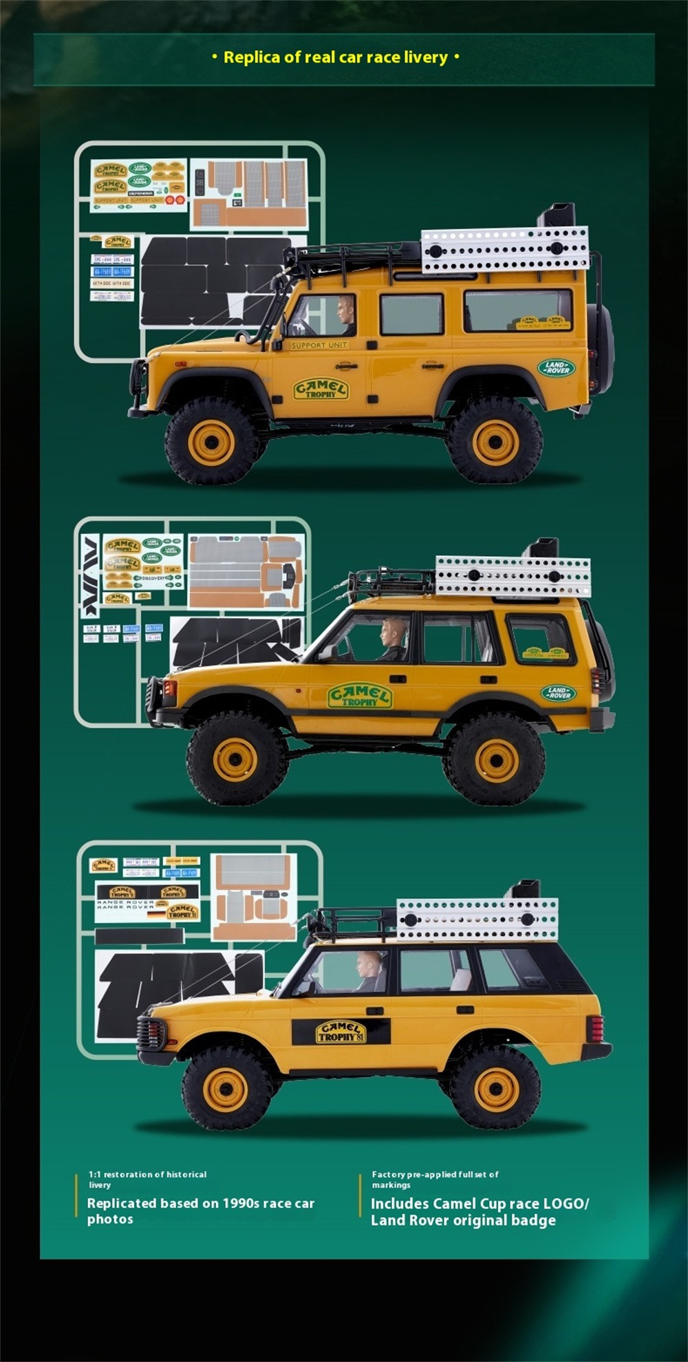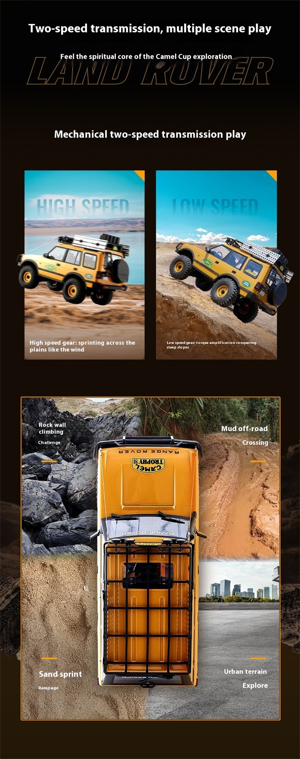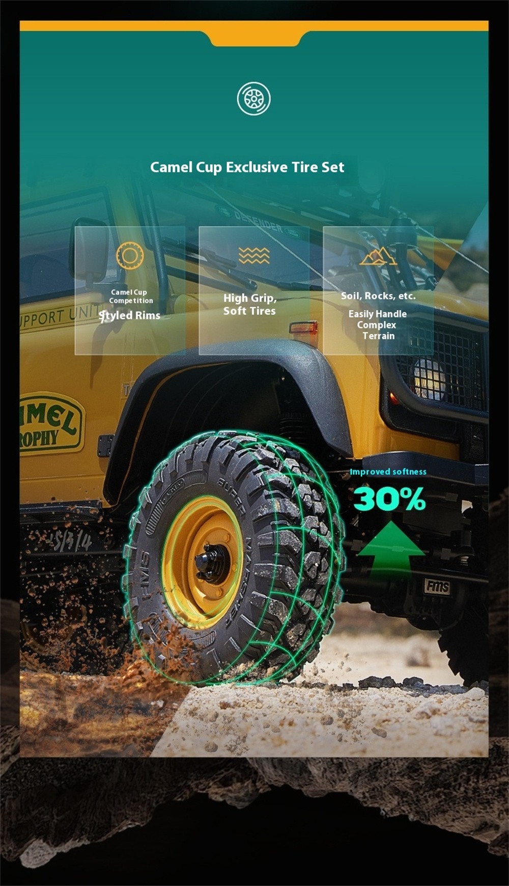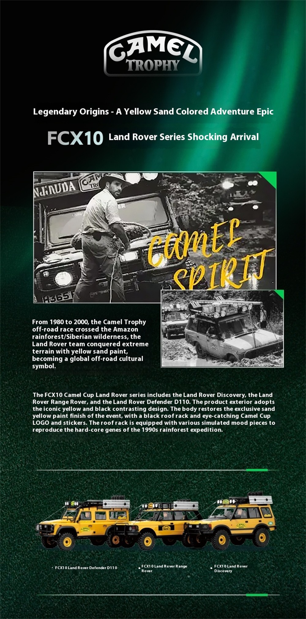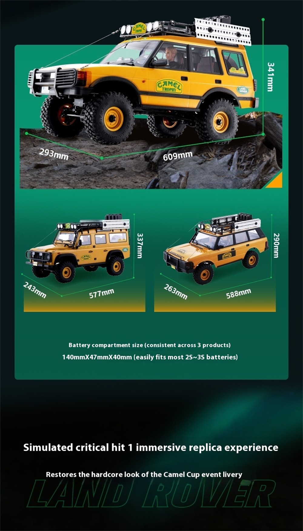 The FMS FCX10 Camel Trophy Edition delivers authentic scale realism and hardcore crawling performance. Officially licensed by Land Rover, this model recreates the legendary Camel Trophy machines — available as Discovery, Range Rover Classic, or Defender 110 editions.