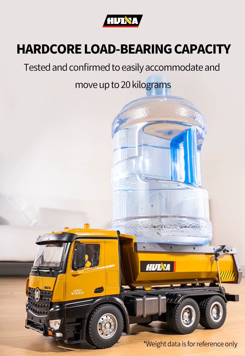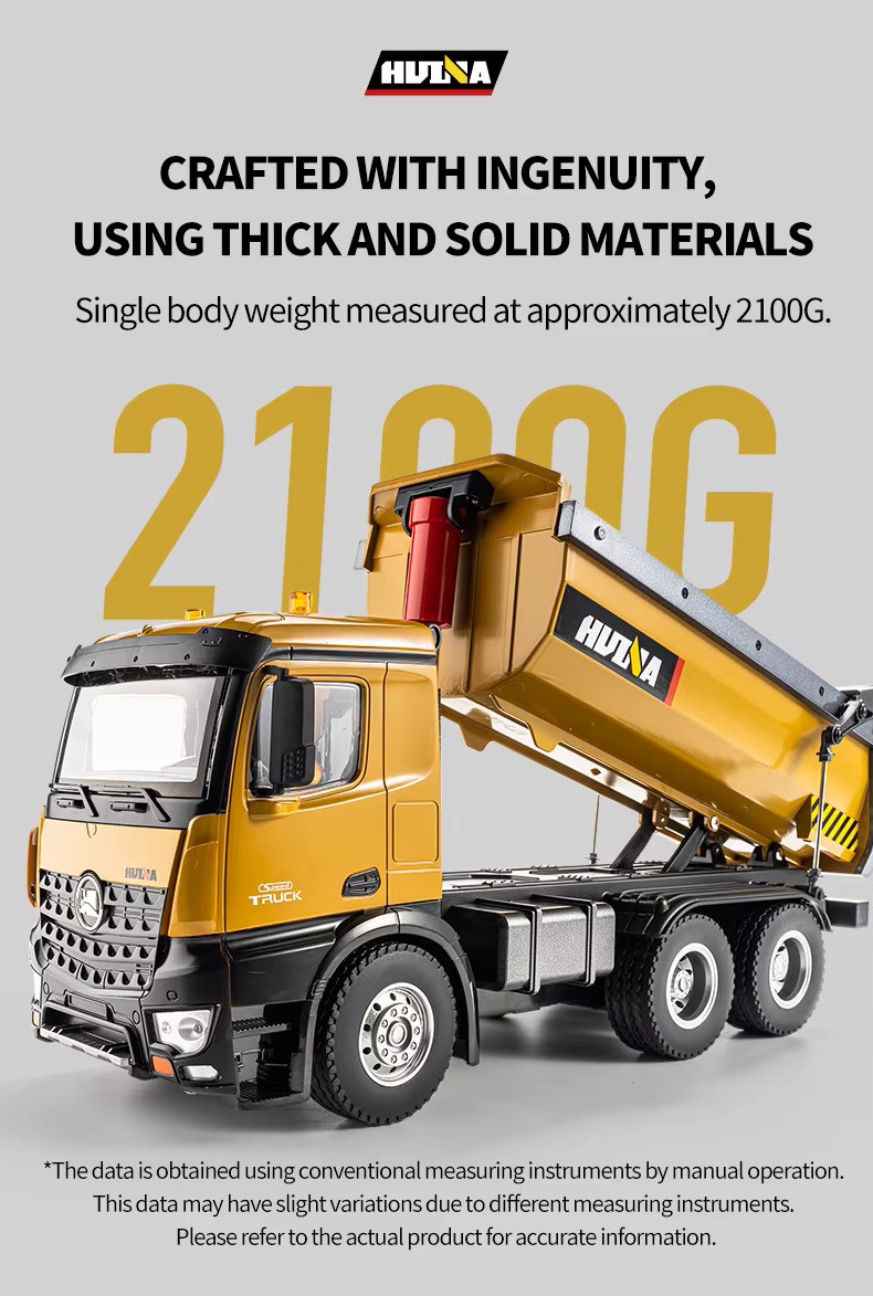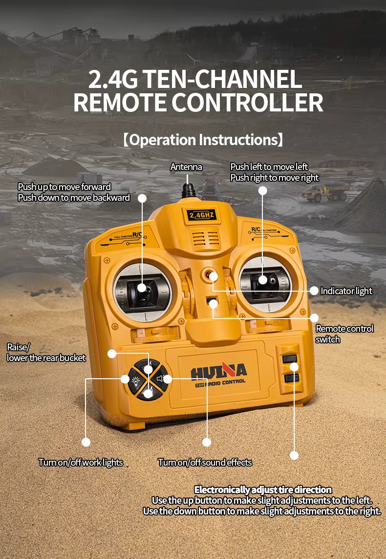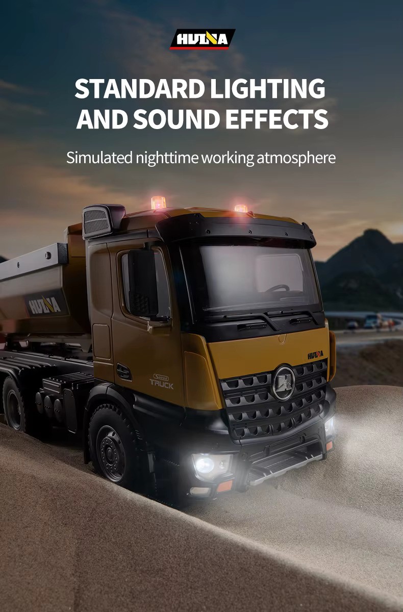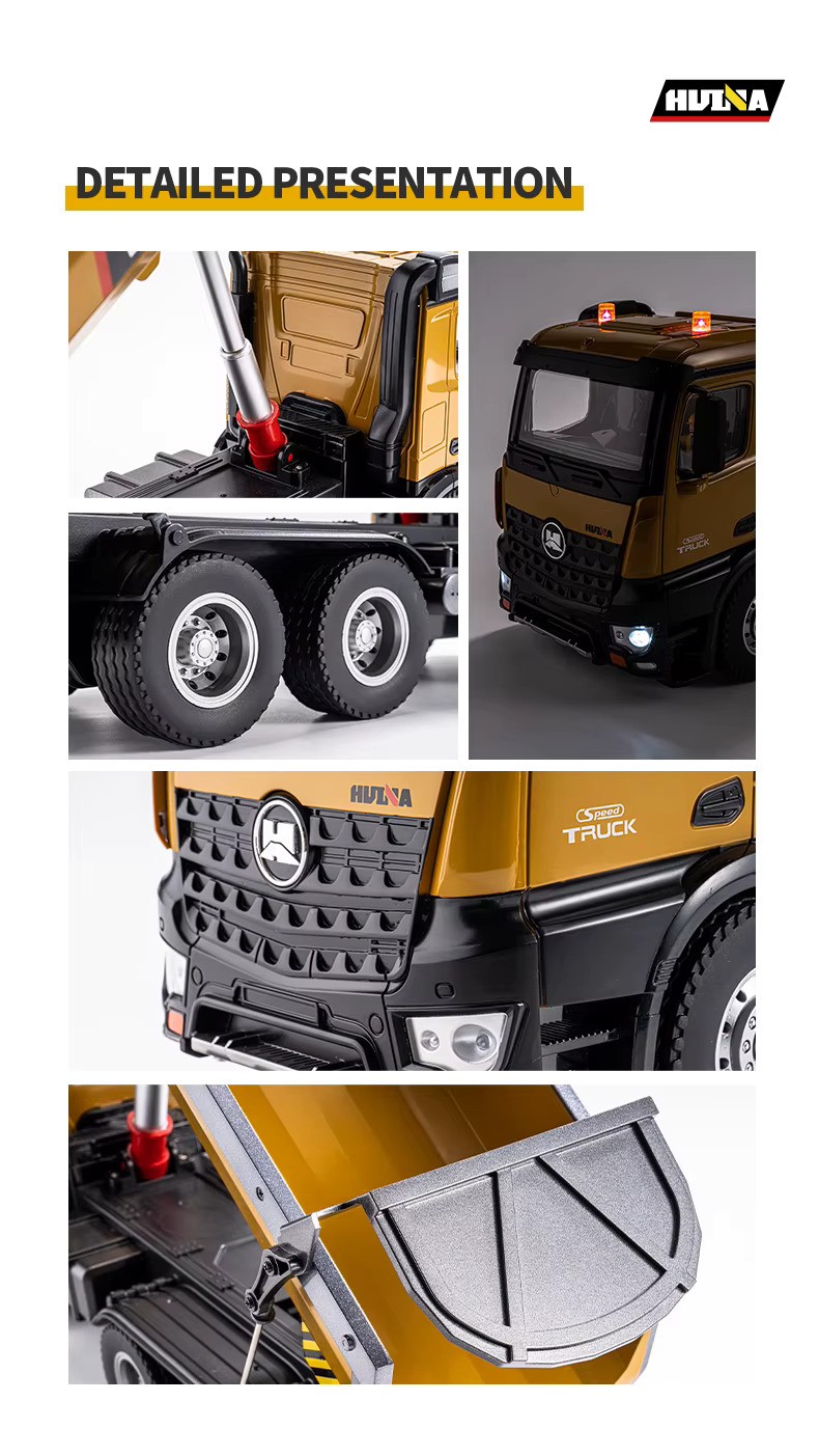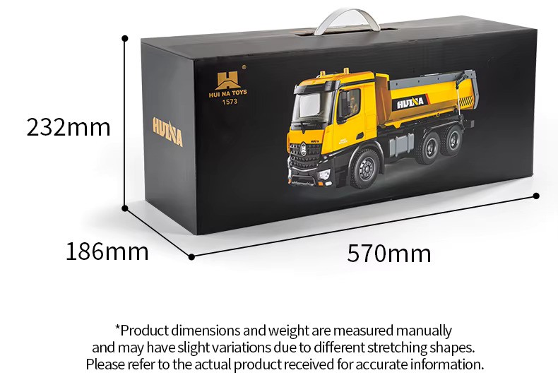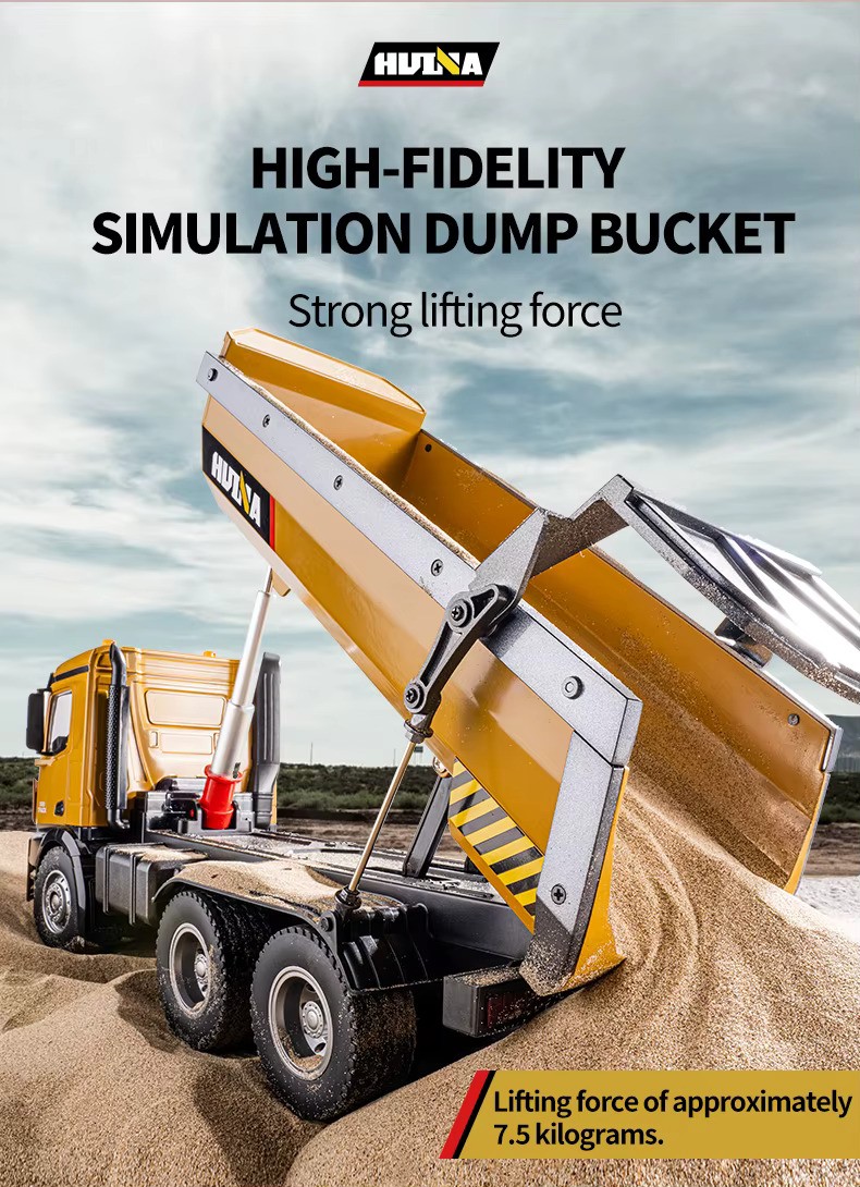The HUINA 1573 is a high-quality 1:14 scale remote control dump truck, engineered with a metal dumping bed, powerful brush motor, realistic construction design, and full 10-channel operation. Ideal for kids, teens, RC hobby enthusiasts, and construction vehicle collectors.