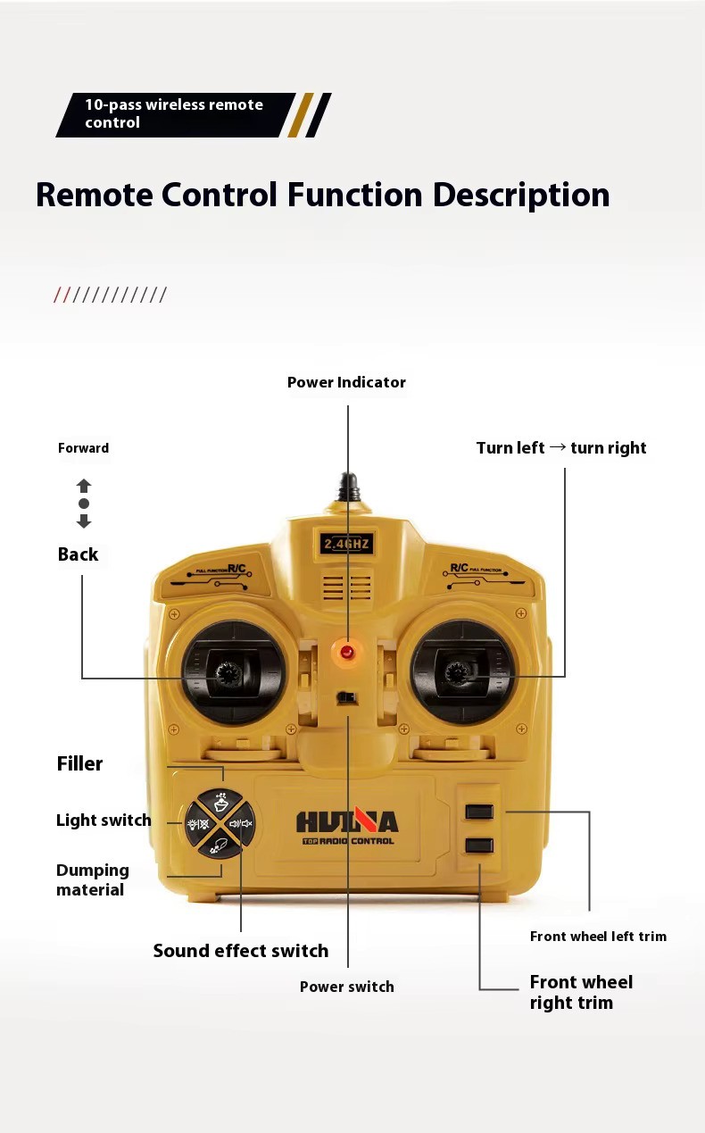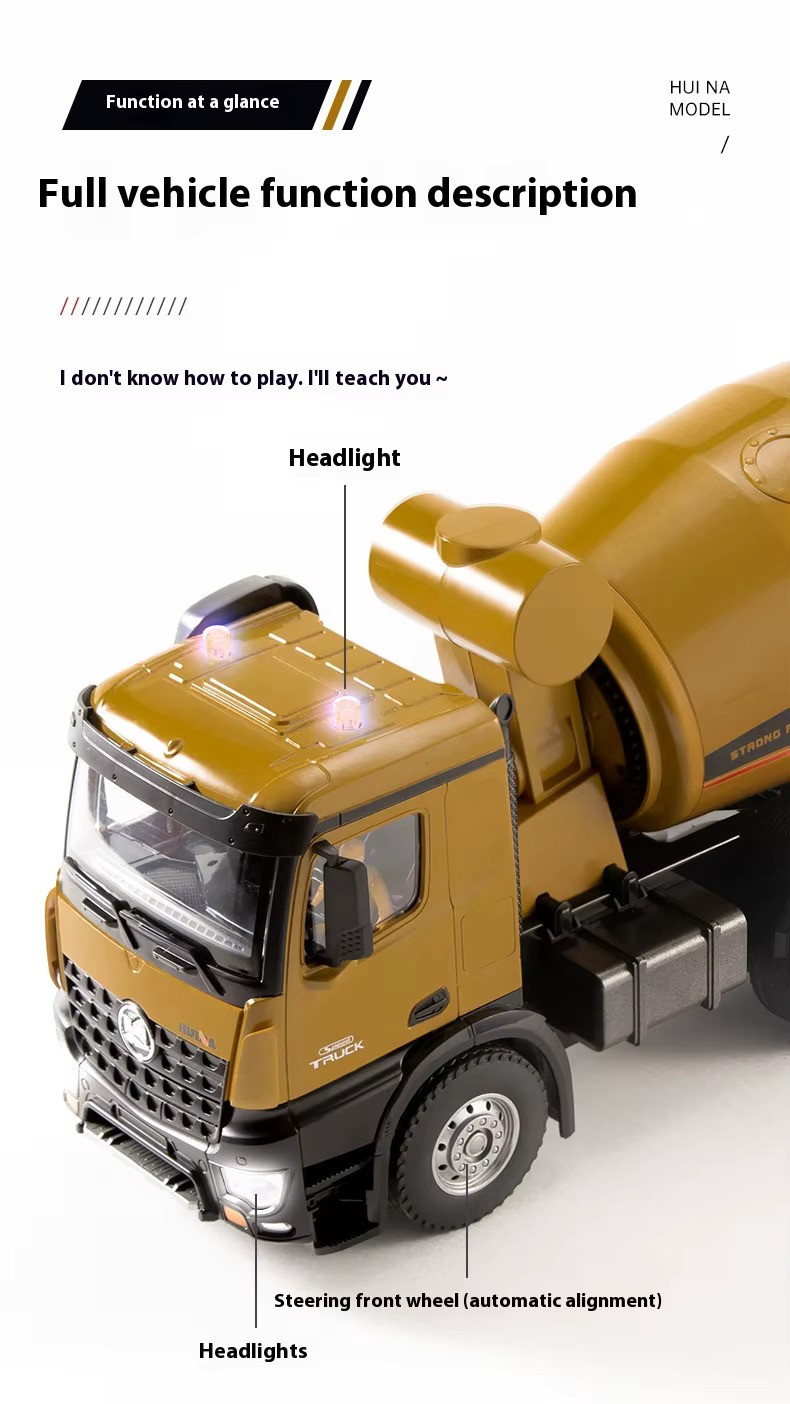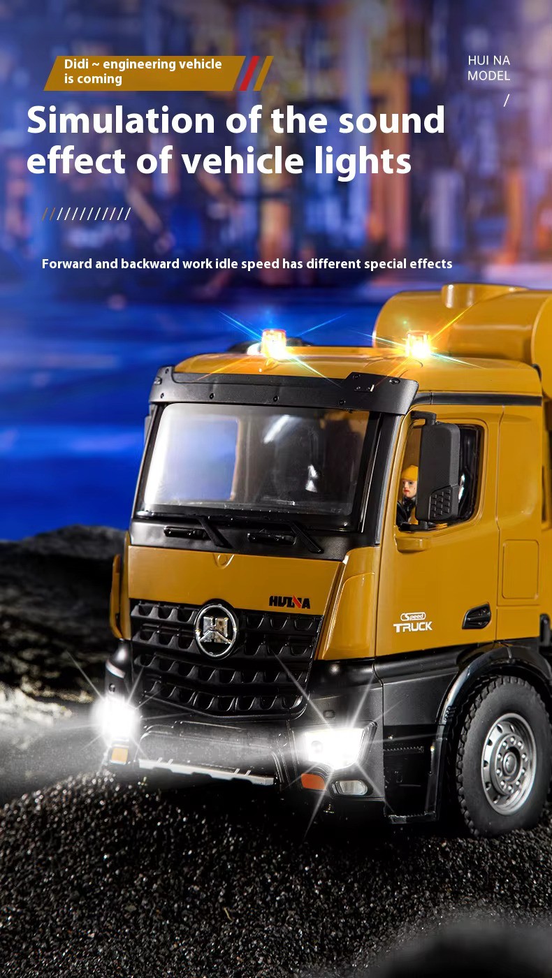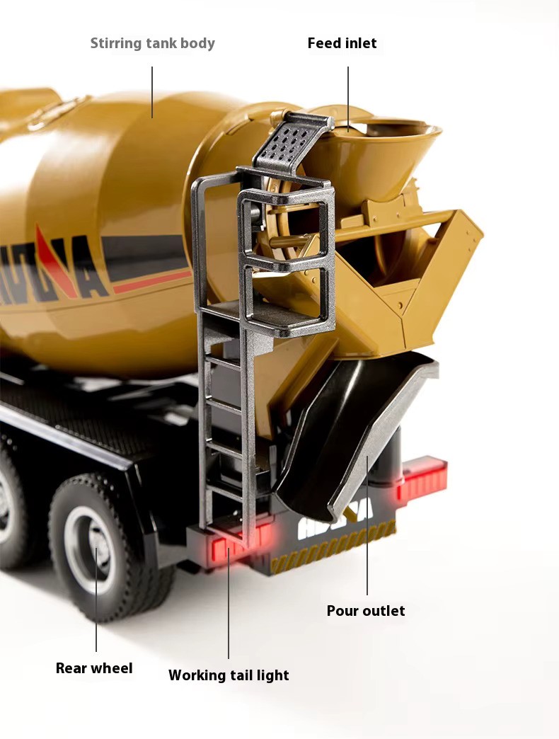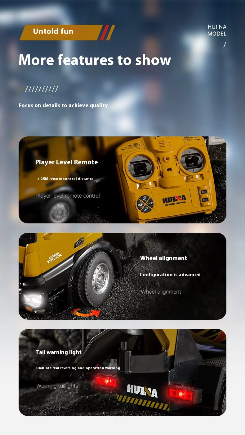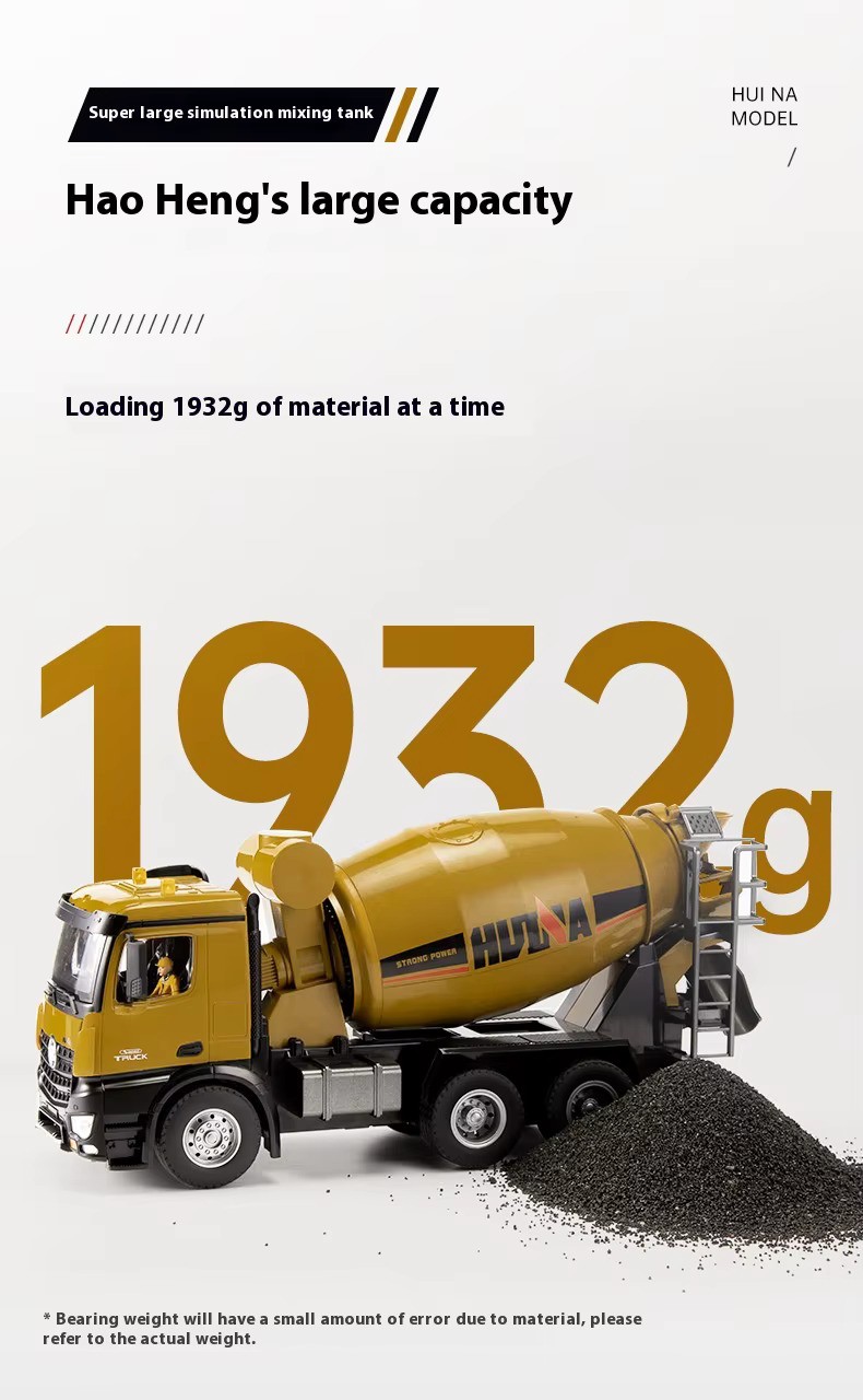 Built for realistic operation, the HUINA 1574 features full directional movement along with a working cement mixing drum. Powered by a lithium battery and controlled via a 2.4G remote system, it ensures stable, interference-free driving up to 30–50 meters.