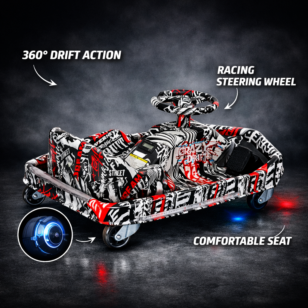 Experience thrilling rides with the Electric Drift Kart, designed for exciting 360° drifting action. Built with a durable frame, comfortable seat, and smooth drift wheels, this electric kart delivers fun and performance for kids and adults alike. The stylish graffiti design gives it a sporty look while the powerful motor ensures smooth acceleration and control.