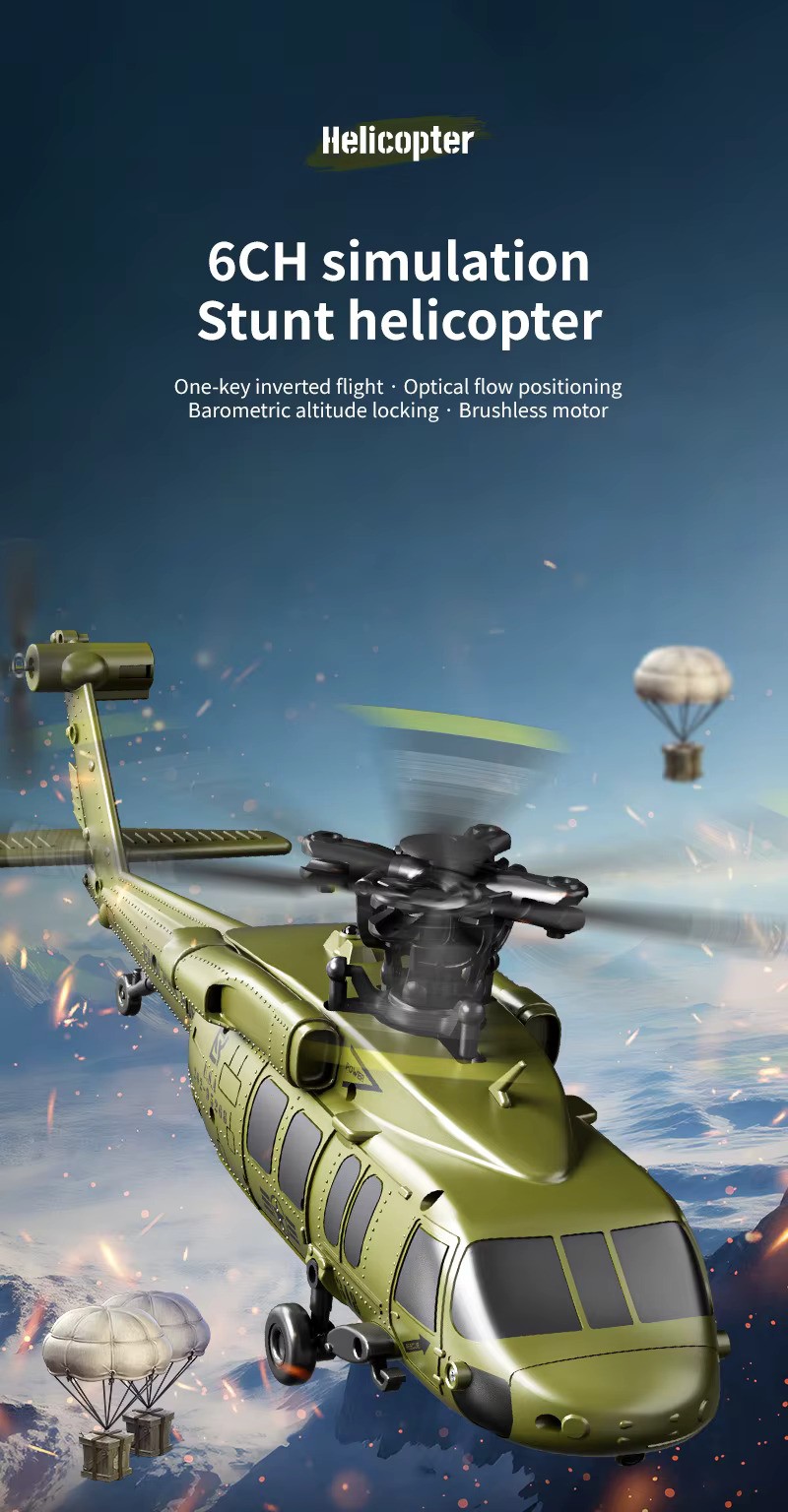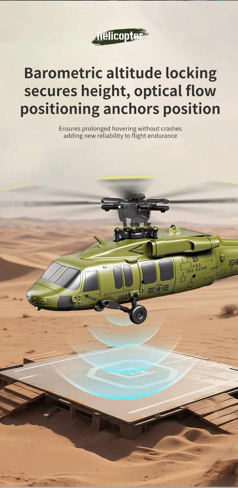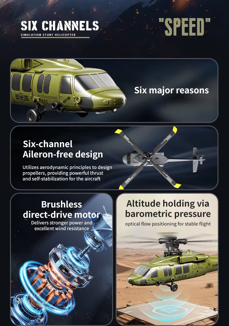 The JJRC U9901 is a 6-channel brushless RC helicopter designed for stable, smooth, and powerful flight. With optical flow positioning, a 6-axis gyro, altitude hold, and one-button flight functions, it is suitable for beginners while still offering advanced control for expert pilots.
