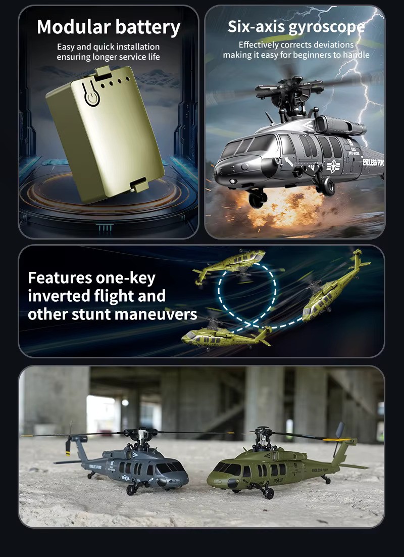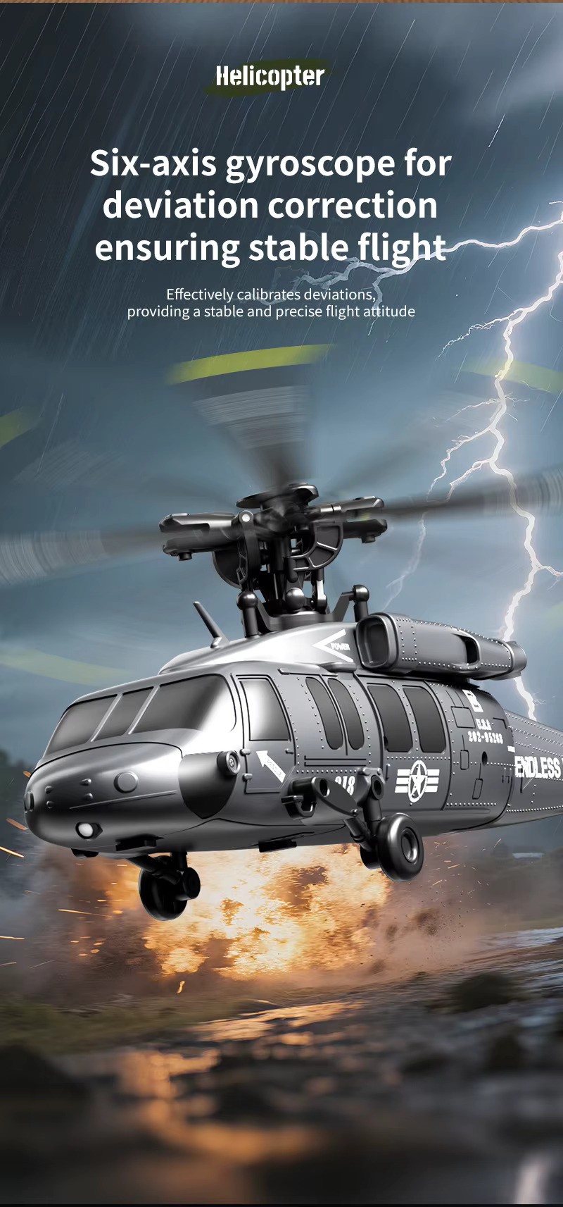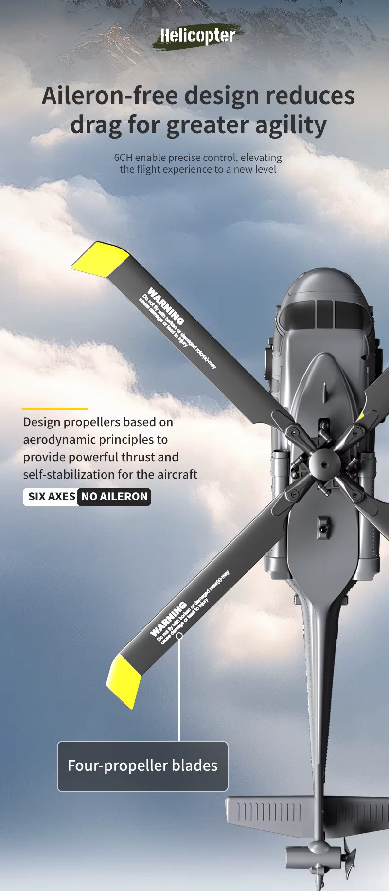 Six-channel helicopter with aerodynamic blade design for strong lift and excellent self-stability.