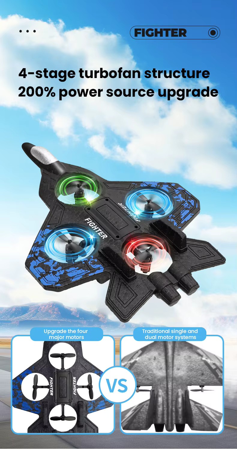 Equipped with 4 turbofan motors, this RC glider performs 360° flips, rolls, and stunt flights with ease. It features headless mode, one-key takeoff/landing, one-click return, emergency stop, and multi-directional control — ensuring smooth, stable, and thrilling flights every time.
