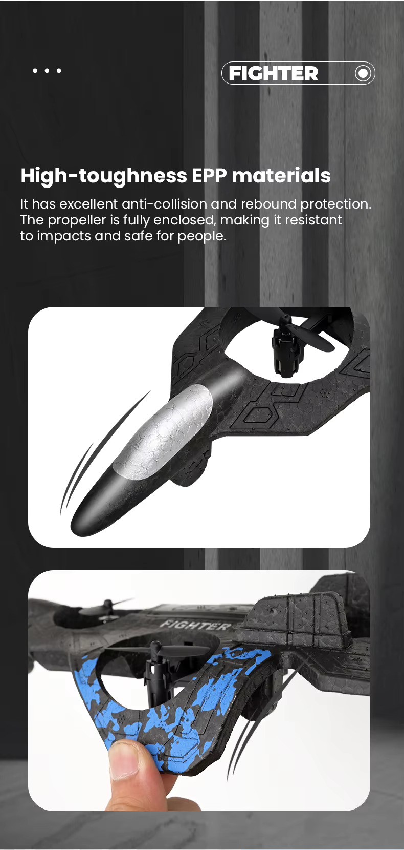 Made from impact-resistant EPP foam, this RC airplane is lightweight yet strong. The propellers are protected with safety guards to prevent injuries and reduce damage during crashes — making it perfect for kids and beginners.