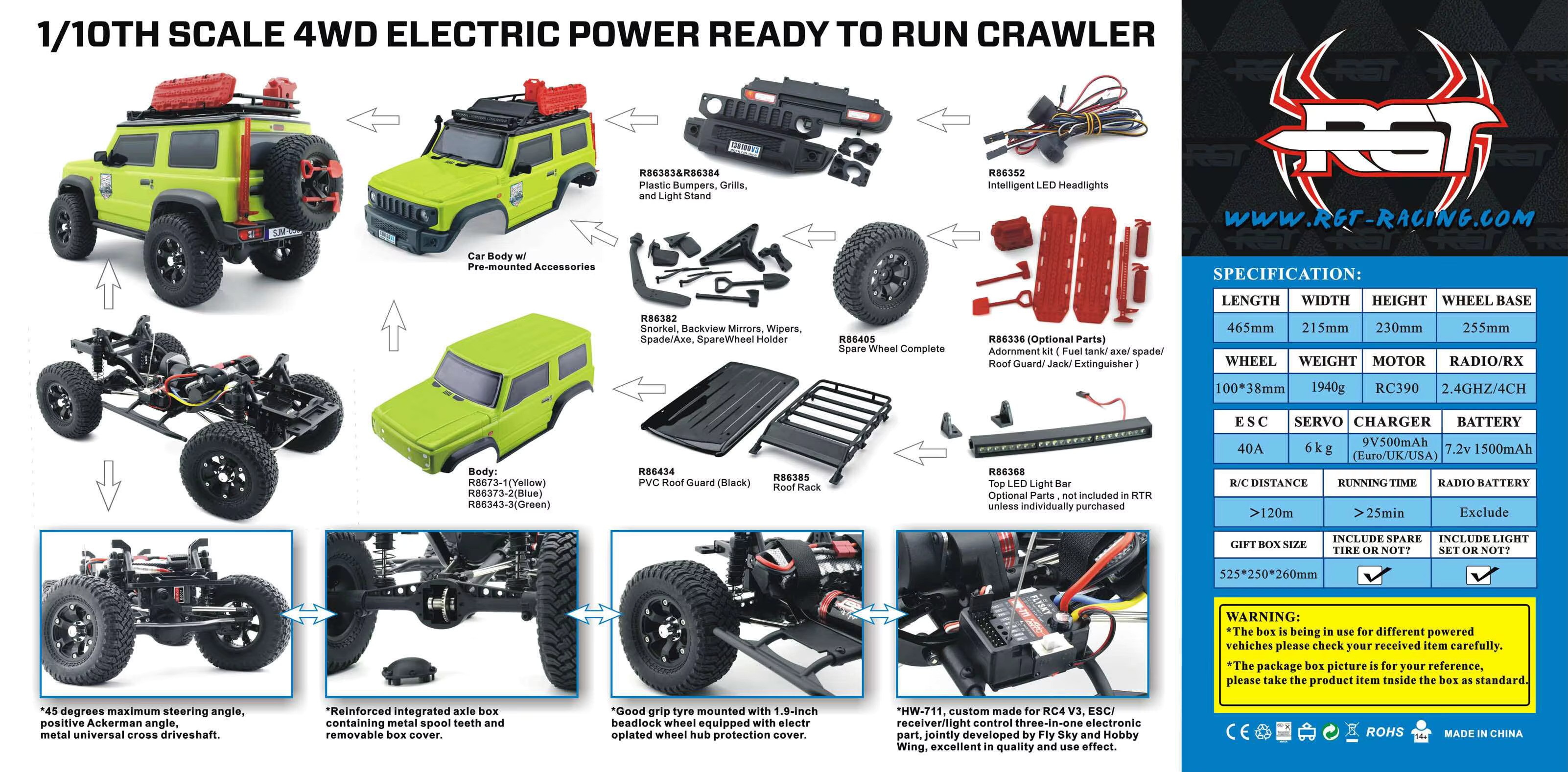 The RGT 136100 V3 / 136100V3-FD is a 1/10 scale 4WD RTR electric RC crawler, designed for off-road driving, trail running, and light rock crawling. Built with a durable metal and plastic chassis, this model delivers stable handling, reliable power, and excellent climbing capability for both beginners and experienced RC enthusiasts.