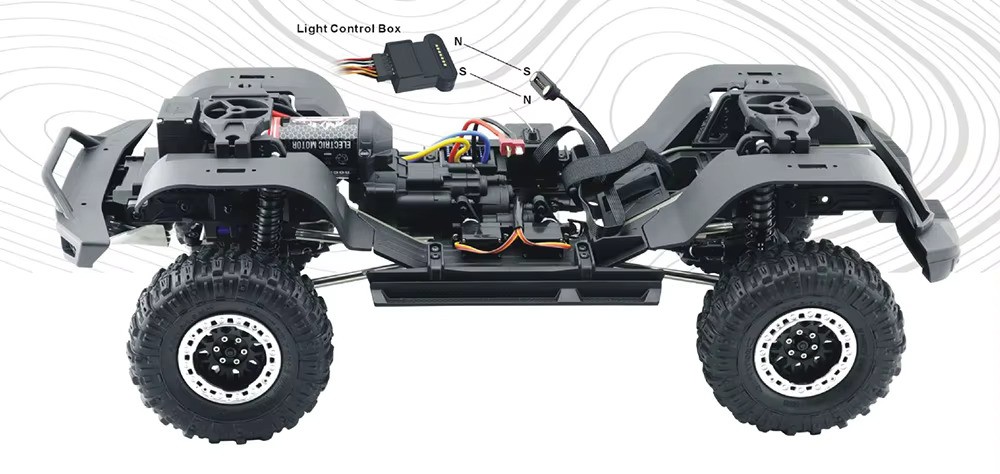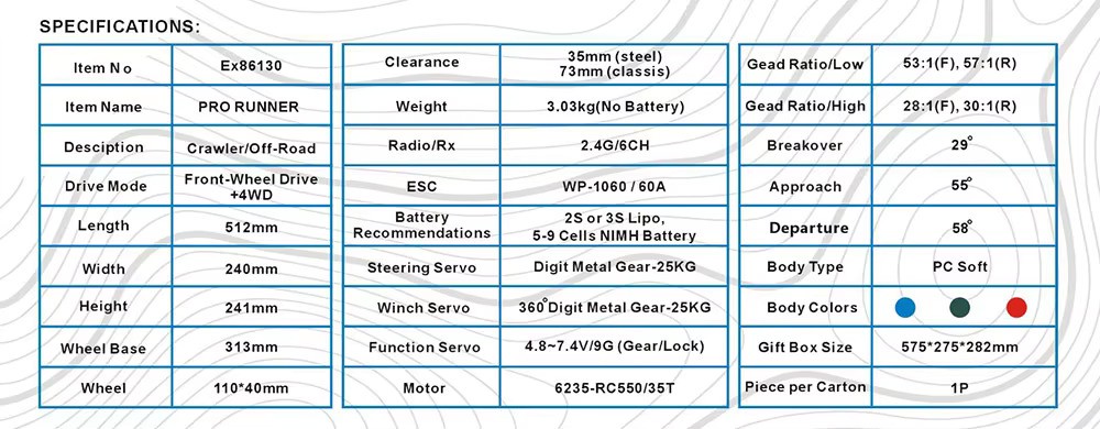 Powered by a Hobbywing 60A crawler-specific ESC, the Pro Runner supports 3S brushed power, offering smooth low-speed control and strong climbing performance. With a 6-channel 2.4GHz remote, switchable drive modes, factory-installed winch, and multi-mode LED lighting, this crawler is ideal for enthusiasts who demand realism and performance in one machine.